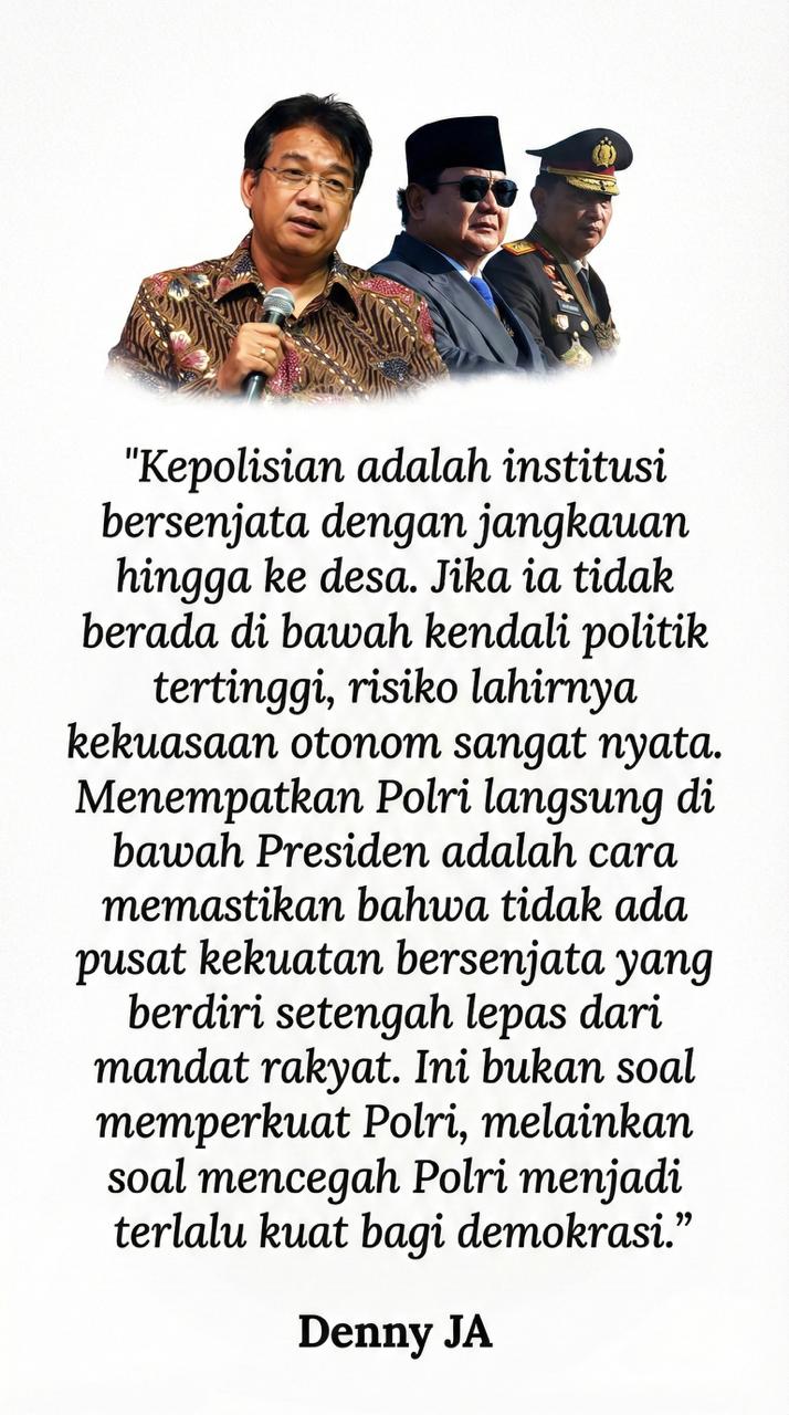 Menempatkan Polri langsung di bawah Presiden adalah cara memastikan bahwa tidak ada pusat kekuatan bersenjata yang berdiri setengah lepas dari mandat rakyat.